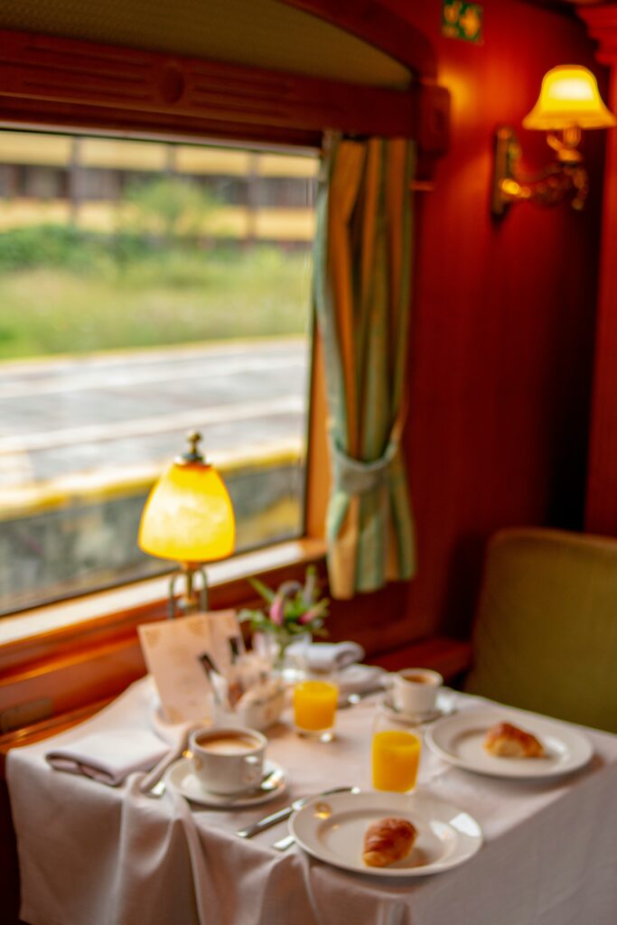 Сърцето на композицията е салон-вагонът – място за аперитив и разговори преди вечеря, с панорамни прозорци, бар и внимателно курирана музика. Вечерята е част от преживяването: сервира се на маса с покривка, подредени прибори, кристал и вина, подбрани за маршрута. Обслужването е дискретно и последователно – персоналът познава графика на влака и синхронизира сервиза с тунели, мостове и фото-спиращи гледки, така че чашите да не „пътуват“ повече от вас.